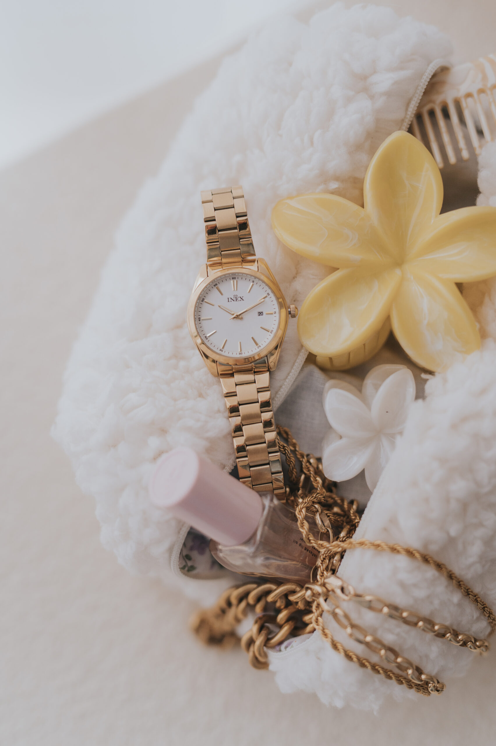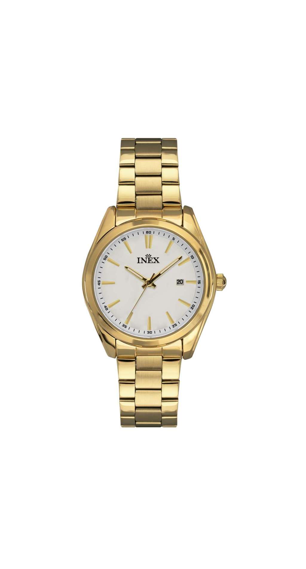Tidløs dameklokke fra Inex med 30 mm gullfarget urkasse i rustfritt stål, hvit skive og komfortabel stållenke. Presist Miyota 2035-urverk, datovisning kl. 3, mineralglass og 30 m vanntetthet gjør den perfekt til hverdagsbruk.