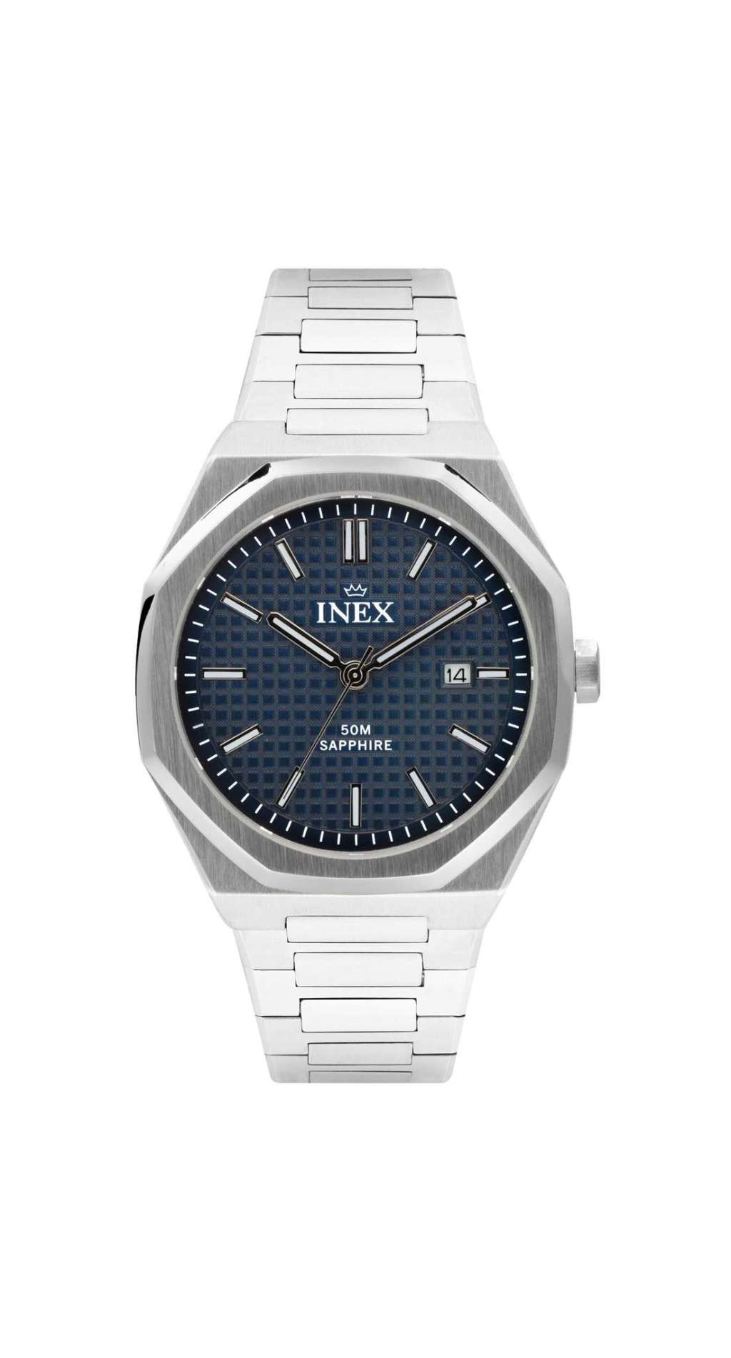 Eksklusiv herreklokke fra Inex med 40 mm åttekantet stålkasse og integrert stållenke i sølvfarget finish. Den blå, strukturerte skiven har tydelige indeksmarkeringer og datovisning klokken 3. Klokken drives av presist quartz‑urverk, har ripebestandig safirglass og 50 m vanntetthet – en moderne, maskulin og tidløs modell til både hverdags og mer formelle anledninger.